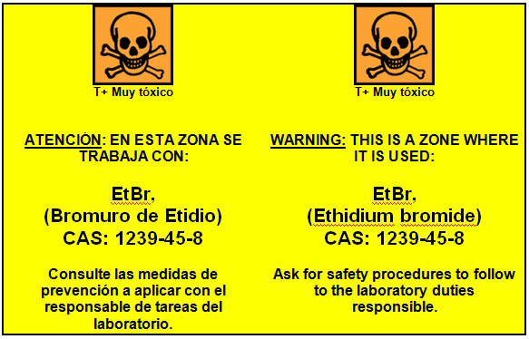 En los laboratorios, o zonas concretas de los mismos en los que se trabaje con EtBr será necesario identificar, mediante algún elemento señalético, que se trabaja con dicha entidad química. Por poner un ejemplo, podría ser…