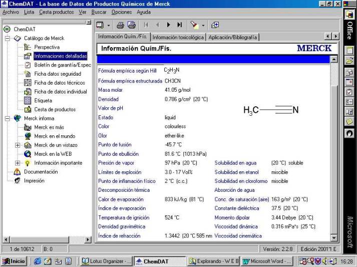 • En Información químico-física Ud. encontrará: gran variedad de datos acerca de las propiedades de la sustancia (densidad, pto. fusión, presión de vapor, etc…)