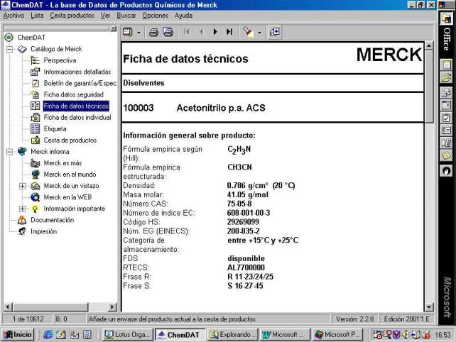 • Información general sobre el producto: lo más útil a nuestros efectos es el número CAS, el número de registro EINECS, la categoría de almacenamiento, las frases R y S.